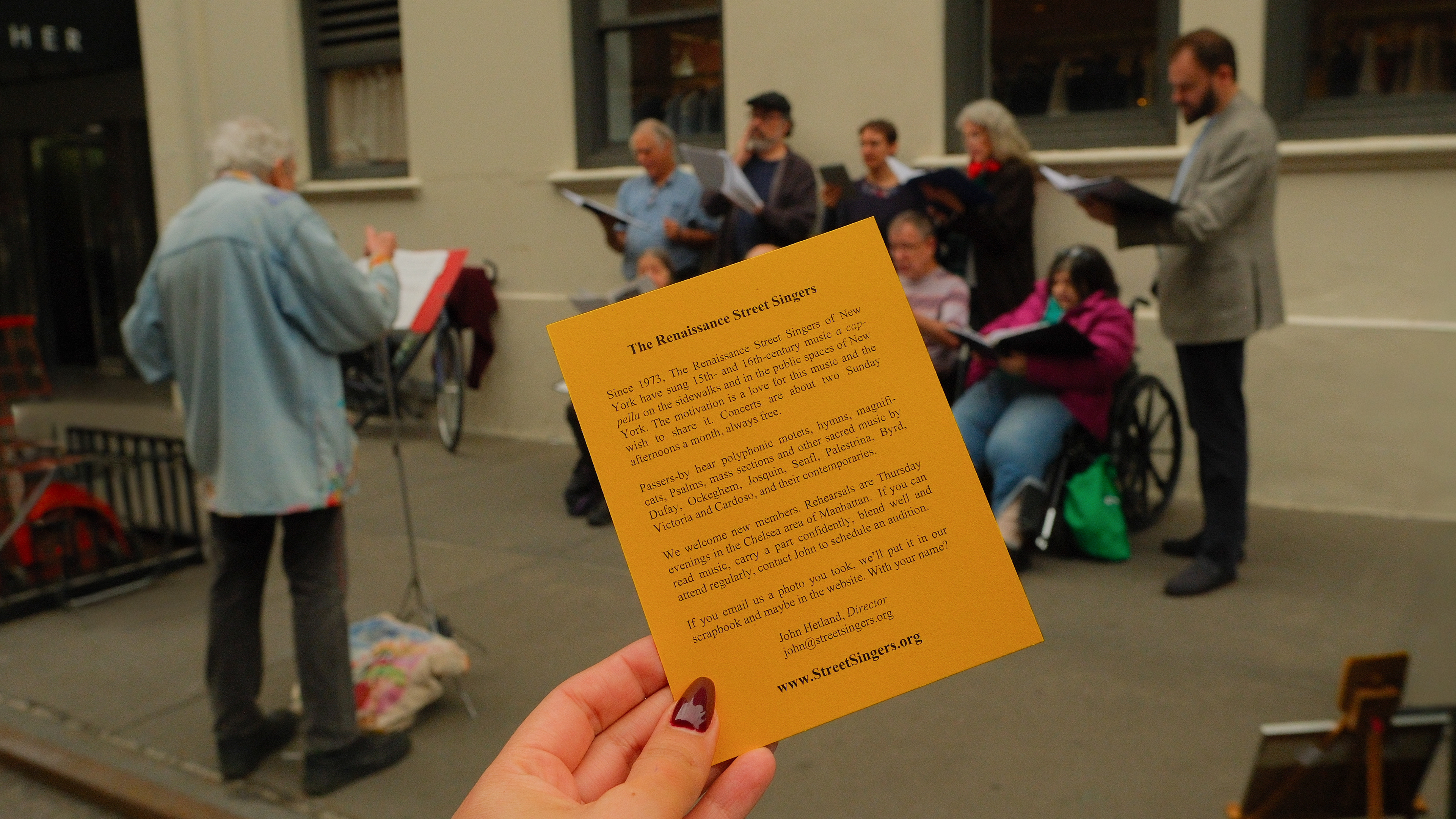 Video and photography capturing The Renaissance Street Singers of New York, performing polyphonic a cappella music from the late 15th to early 17th century.